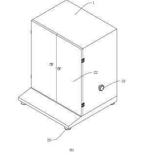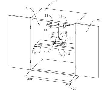 參照?qǐng)D1,包括殼體1、工作臺(tái)2、盛液盒3和標(biāo)準(zhǔn)板4,殼體1內(nèi)設(shè)置有工作腔5,殼體1底部設(shè)置有多個(gè)支撐腳20,在本申請(qǐng)實(shí)施例中,支撐腳20設(shè)置為四個(gè),四個(gè)支撐腳20設(shè)置于殼體1的四角位置;殼體1上鉸接有兩轉(zhuǎn)動(dòng)門22;工作臺(tái)2設(shè)置于工作腔5內(nèi),工作臺(tái)2上開(kāi)設(shè)有與盛液盒3適配的放置槽21,盛液盒3可放置于放置槽21中,標(biāo)準(zhǔn)板4設(shè)置于盛液盒3上方,標(biāo)準(zhǔn)板4通過(guò)升降結(jié)構(gòu)可升降連接于殼體1上,工作臺(tái)2上固定連接有水平儀6,在本申請(qǐng)實(shí)施例中水平儀6選用氣泡式水平儀,也可選擇其他體積較小的水平儀;工作臺(tái)2和殼體1之間設(shè)置有用于調(diào)平工作臺(tái)2的調(diào)平結(jié)構(gòu)。