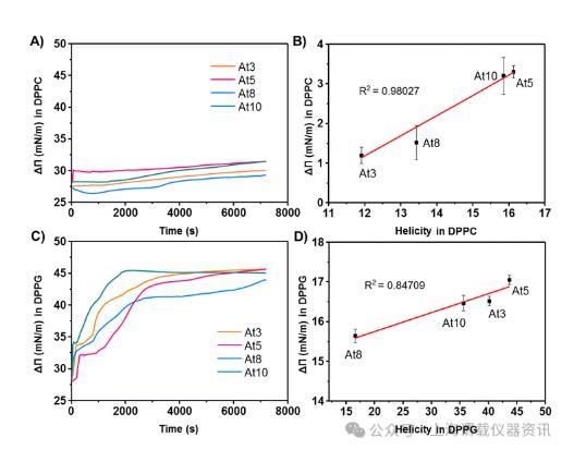 圖4、(A和C)在亞相中注射抗菌肽后DPPC和DPPG脂質單層的表面壓力變化。(B和D)分別在注射抗菌肽(AMP)后DPPC和DPPG脂質單層表面壓力的增加與DPPC和DPPG中AMP的螺旋度之間的相關性。注射抗菌肽后兩性離子DPPC脂質單層表面壓力的增加非常小,而陰離子DPPG脂質單層表面壓力的增加相當高。