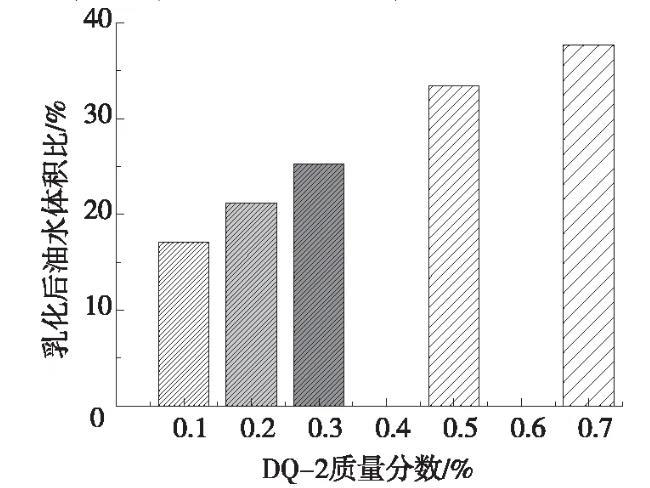 由圖4可知,不同濃度的DQ-2體系均具有一定的乳化作用,隨著體系濃度的增加,吸水量不斷降低,原油乳化作用不斷增強。當DQ-2體系的質量分數達到0.5%時,油水體積比為33.47%,后期繼續提高DQ-2體系的使用濃度,油水體積比趨于穩定,通過實驗證實,DQ-2體系對于原油具有較好的乳化作用。