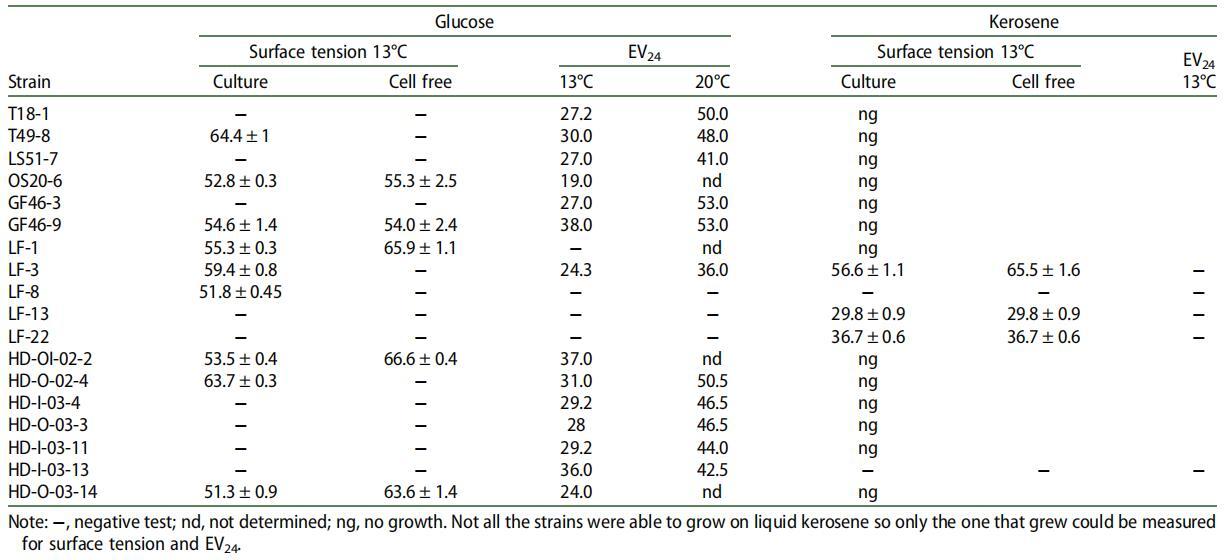 表 1. 在葡萄糖和煤油上生長(zhǎng)的細(xì)菌菌株的培養(yǎng)物和培養(yǎng)物濾液的表面張力和乳化值。