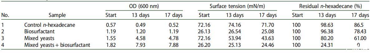 表 4. 正十六烷生物降解試驗(yàn)中的細(xì)菌生長(zhǎng)、表面張力和正十六烷殘留量(結(jié)果為兩次重復(fù)的平均值)。