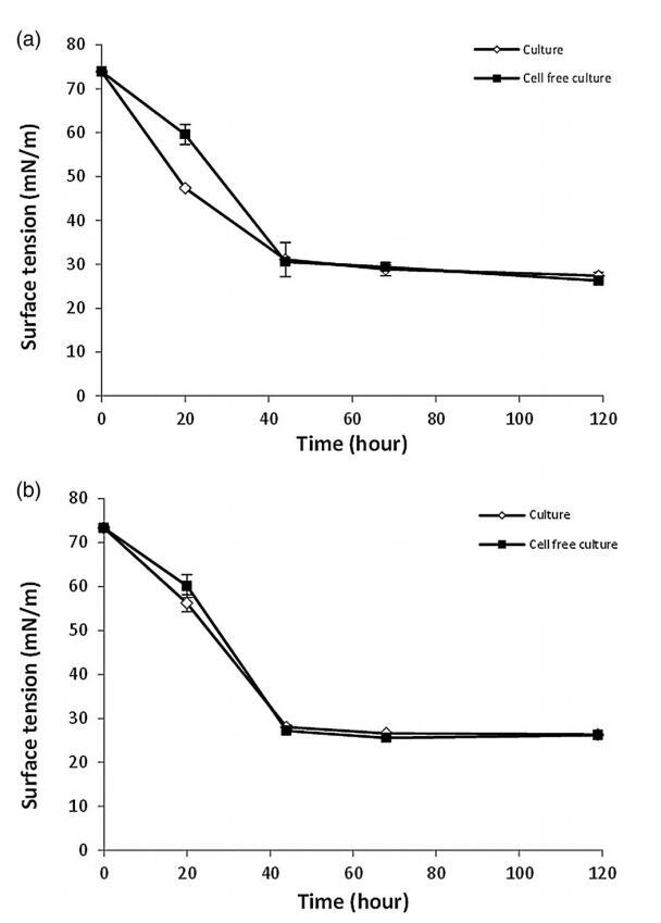 菌株紅球菌屬。 菌株 LF-13 和紅球菌屬。 大約 2 天后,菌株 LF-22 達(dá)到穩(wěn)定期(圖 1)。 LF-13 和 LF-22 的培養(yǎng)物表面張力的最低值分別為 31.8 和 29.3 mN m-1,當(dāng)培養(yǎng)物達(dá)到穩(wěn)定期時(shí)(圖 1)。 無細(xì)胞制劑的值顯示出與培養(yǎng)物類似的降低,表明生物表面活性劑被釋放到培養(yǎng)基中。 從工業(yè)角度來看,將生物表面活性劑分泌到培養(yǎng)基中的分離物很有趣,因?yàn)檫@使得生物表面活性劑的純化過程更簡(jiǎn)單。 [16,44,45]