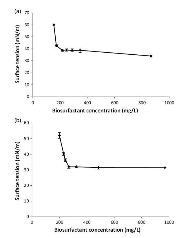 如材料和方法部分所述,使用 MTBE 從兩種紅球菌屬菌株的靜息細(xì)胞培養(yǎng)物中提取生物表面活性劑。 提取的生物表面活性劑用于測(cè)定CMC濃度。 來自菌株 LF-13 的生物表面活性劑的 CMC 約為 217 mg/L,菌株 LF-22 的 CMC 約為 269 mg/L(圖 3)。