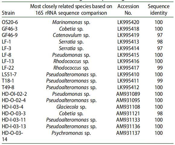 通過 16S rRNA 基因序列分析對(duì)具有顯著 SAC 活性的 18 個(gè)分離株進(jìn)行分類鑒定(表 2)。 紅球菌除外。 菌株 LF-13 和紅球菌屬。 在菌株 LF-22 中,大多數(shù)鑒定的 SAC 生產(chǎn)者是革蘭氏陰性菌,屬于 γ-變形菌綱。 也有報(bào)道稱 γ-變形菌在寒冷海洋地區(qū)的石油污染地點(diǎn)占優(yōu)勢(shì)。 [21-24] 先前對(duì)石油污染地點(diǎn)的研究表明,假單胞菌、假交替單胞菌、冰川、海藻和紅球菌是極地、海洋區(qū)域。[21,22,25-28]