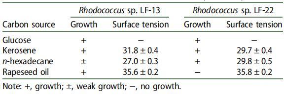 兩種細(xì)菌菌株紅球菌屬。 菌株 LF-13 和紅球菌屬。 當(dāng)以煤油作為唯一碳源和能源時(shí),菌株 LF-22 能夠?qū)⑴囵B(yǎng)基的表面張力降低約 40 mN m-1。 因此,它們被選擇用于進(jìn)一步表征生物表面活性劑的生產(chǎn)。 為了拓寬生物表面活性劑生產(chǎn)的底物范圍,測(cè)試了除煤油和葡萄糖之外的其他碳源(表 3)。 這兩種菌株可以在葡萄糖上生長(zhǎng),但不合成生物表面活性劑。 他們能夠在正十六烷和菜籽油上產(chǎn)生 SAC,即使菜籽油不支持菌株 LF-22 的生長(zhǎng)。