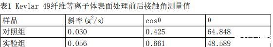 測(cè)量結(jié)果如下表所示,測(cè)量結(jié)果為三次平行樣的平均值。可見(jiàn)經(jīng)等離子體表面處理后,芳綸纖維與水的表面接觸角降低16°,潤(rùn)濕性提高。