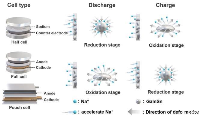 該工作闡述了液態金屬界面張力與電極電勢之間的關系,并闡明了電極電勢對Na+電化學傳輸速率的影響(圖1)。在還原反應過程中,電極電勢降低,液態金屬的界面張力加快了Na+向內的傳輸速率。在氧化反應過程中,電極電勢增加,液態金屬表面電荷密度增大,界面張力下降,加快了Na+向外的傳輸速率。在此基礎上,為了加強液態金屬結構穩定性,構筑液態金屬核殼包覆結構(LMNCs),其自調節的界面張力有效改善了Na+傳輸動力學過程。