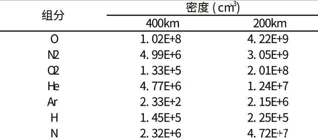 眾所周知,低地球軌道氣體主要成分是原子氧,占地軌道氣體總數的80%以上,而超低軌氣體環境與低軌有很大不同,其成分主要是分子氮(N)和原子氧(O)。表1給出了不同軌道高度下大氣組分密度的變化,從表中明顯看出,在400 km軌道,原子氧(O)的密度為1.0E+8 cm-3,比分子氮(N)密度高兩個數量級4.99E+6 cm-3;而在00 km軌道,原子氧(O)的密度為4.E+9 cm-3,分子氮(N)密度與其在同一數量級3.05E+9 cm-3。