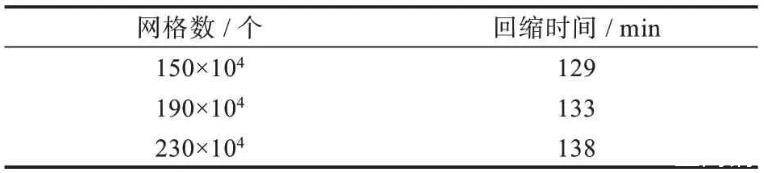 為了避免系統回流的影響,建立一個長×寬×高為50 mm×10 mm×10 mm的流場模型,采用結構化網格,如圖2所示。通過fluent的Eulerian模型、層流模型、Carreau黏度模型、壓力求解器,對PS/POE液液兩相流進行仿真分析。由于實驗時間較長,采用瞬態求解法,忽略重力、浮力、密度差、加熱不均帶來的影響。入口設置為速度邊界條件,出口邊界為壓力出口,流場上下前后4個面為周期邊界條件。為了確保仿真過程的準確性和經濟性,以及獲得兩相流真實的分布情況,首先對網格無關性進行研究??紤]3種數量(150×104、190×104、230×104個)的網格進行研究。當網格數量太少時,無法細致描述液滴表面處的形態(橢球型)。通過數值模擬,分析了液滴回縮時間t。從表2中可以看出,網格數量對于計算結果的影響很小,同時考慮到數值模擬計算的時間和經濟性,采用190×104個網格。收斂時間的判斷依據殘差圖以及液滴形態兩個標準,計算每一步的殘差值設定為10-3,同時設置主視、俯視、左視3個監測面(均位于球心處)用來觀察液滴形態。形態為球形時,計算收斂。