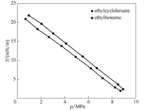 為探究相同碳原子數(shù)、不同結(jié)構(gòu)的影響,選取60℃下CO2-乙基環(huán)己烷/乙苯體系進(jìn)行比較。由圖7可以看出,兩種體系的界面張力下降趨勢基本相同,但CO2-乙苯的界面張力略高于CO2-乙基環(huán)己烷體系。姬澤敏等、Nagarajan等曾對CO2-苯/環(huán)己烷體系的界面張力進(jìn)行過測定,發(fā)現(xiàn)兩種體系界面張力隨壓力變化的等溫線幾乎重合,而CO2-乙基環(huán)己烷/乙苯體系界面張力差異明顯。從分子層面考慮,這是由于乙苯的極性比乙基環(huán)己烷大,從而導(dǎo)致乙苯分子間的相互作用更強,處于界面層的乙苯分子更難擴(kuò)散到CO2中去,使得CO2-乙苯體系的界面張力大于CO2-乙基環(huán)己烷體系。