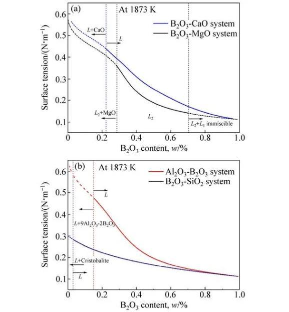 2)含B2O3二元體系中,熔渣表面張力隨B2O3含量的增加而降低,作為表面活性物質,B2O3組元能顯著降低熔渣表面張力。純氧化物表面張力值與形成氧化物的陽離子靜電勢及氧化物中離子鍵分數有關。