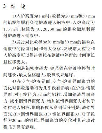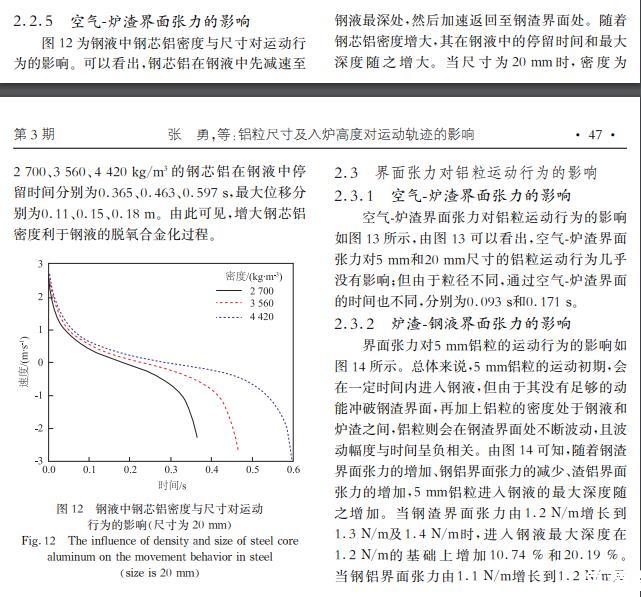 增加鋼渣界面張力、減小鋼鋁界面張力或增加渣鋁界面張力有利于鋁粒進(jìn)入鋼液,而鋁粒的尺寸大于20 mm,界面張力對(duì)鋁塊運(yùn)動(dòng)幾乎沒(méi)有影響;增大密度會(huì)使鋼芯鋁在鋼液中停留更長(zhǎng)時(shí)間,有利于鋼液脫氧。