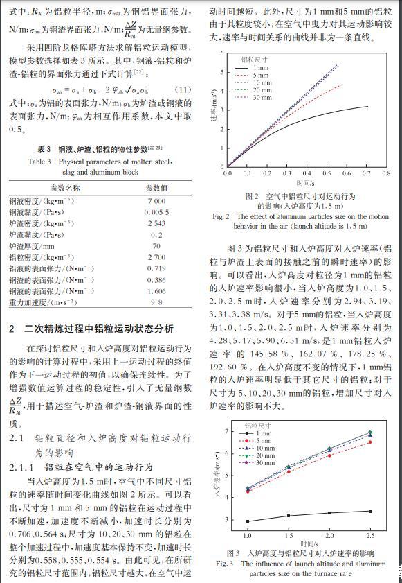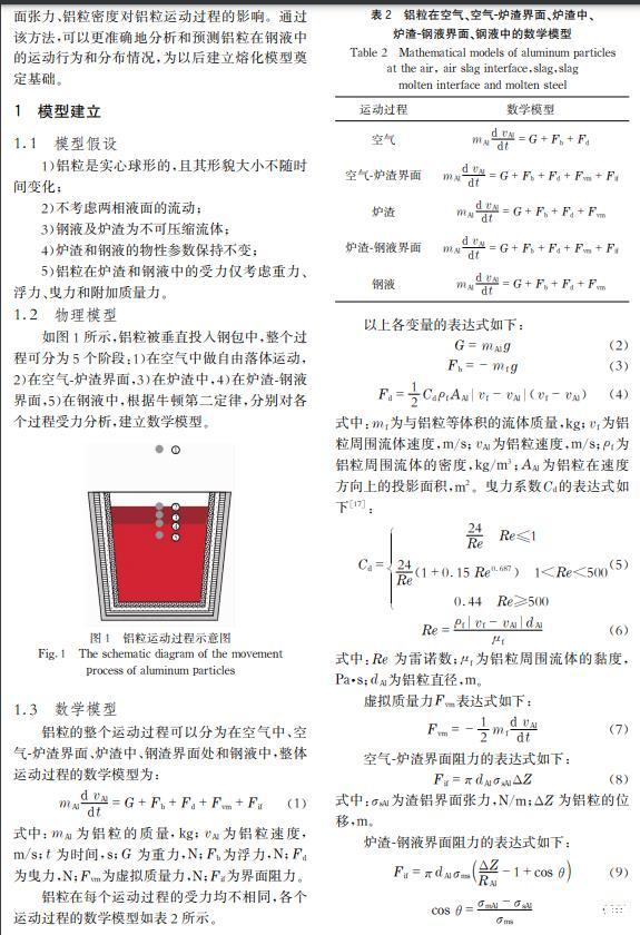 摘要: 二次精煉過(guò)程中,鋁是鋼液進(jìn)行脫氧及合金化的主要物料之一,但純鋁的密度小于鋼液,能否穿越渣層與鋼液接觸及接觸時(shí)間對(duì)鋁的脫氧效果和鋼中溶解鋁的含量有直接影響。在忽略鋁的熔化、溶解及化學(xué)反應(yīng)的情況下,通過(guò)對(duì)鋁粒運(yùn)動(dòng)過(guò)程受力分析,建立鋁粒在氣-渣-鋼相內(nèi)的三維運(yùn)動(dòng)數(shù)學(xué)模型,明晰鋁粒尺寸及入爐高度對(duì)鋁粒運(yùn)動(dòng)軌跡的影響。