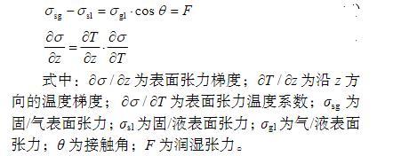 通過對成形過程彎折區域材料的溫度梯度和界面表面張力進行分析可知,激光熱應力成形界面處的表面張力與潤濕角θ的關系可用楊氏方程表示,見式(1)。在成形結束后,界面表面張力的矢量和為零,同時熔凝層表面張力與溫度梯度存在如式(2)所示的關系。