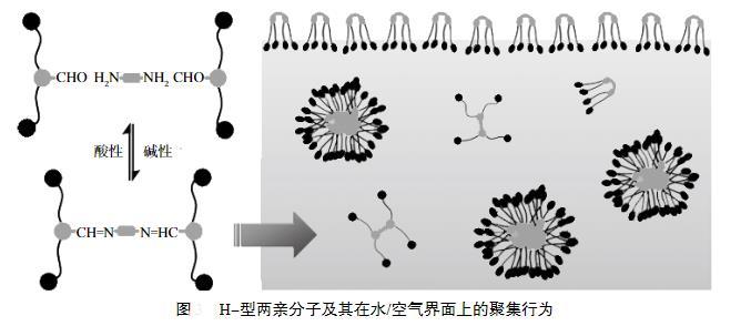 另外一類是含有活性可斷裂鍵的表面活性劑,其中亞胺鍵是一類比較典型的動態共價鍵。許多新穎的基于亞胺鍵構筑的H-型兩親分子,其中亞胺鍵用于連接兩個Bola型的兩親分子,H-型兩親分子自組裝可形成膠束,當pH從堿性調至弱酸性時,亞胺鍵發生水解,從而導致兩親分子的解離以及不同聚集體形態之間的轉變。