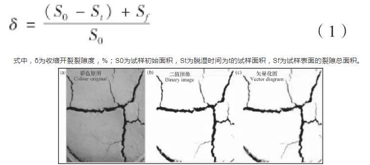 (3)將二值化后的圖轉換為矢量圖(圖1c),用CAD(管理軟件計算機輔助設計)面積提取命令得到試驗收縮和開裂面積,計算得到試驗的收縮開裂裂隙度: