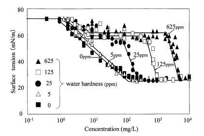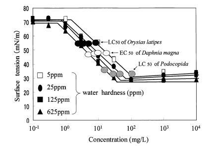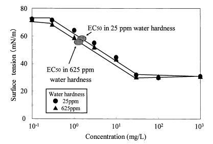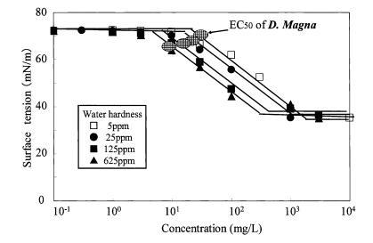 圖 9 水硬度對表面張力的影響 烷基硫酸鹽和有毒表面張力曲線 Daphnia Magna 的價值。