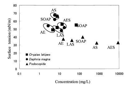圖 2 水生毒性(LC50 或 EC50)和毒性 5 種表面活性劑對 3 種水產品的表面張力 25 ppm 硬度水中的物種。