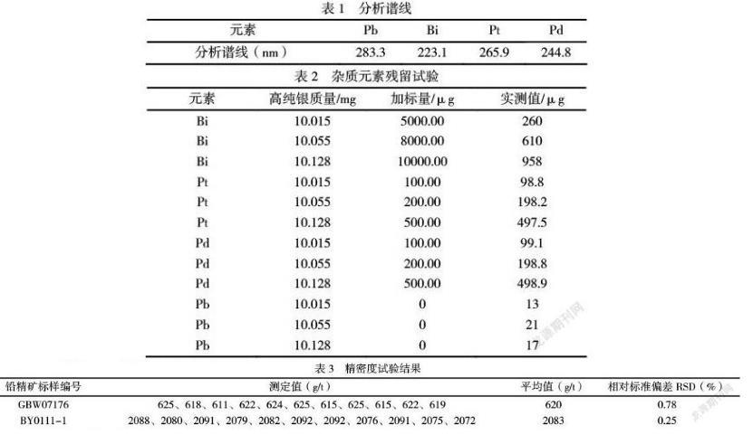 本方法中銀的含量是通過經典重量法減去雜質元素(鉛、鉍、鉑、鈀)和金所得,避免了高倍數的稀釋體積及苛刻環境要求帶來的誤差,分析結果準確穩定、精密度高,適用于鉛精礦中銀含量的測定,滿足行業分析需求。