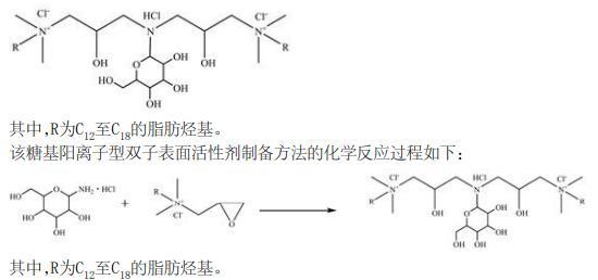 將所需量的2,3-環氧丙基-N,N-二甲基烷基氯化銨和氨基葡萄糖鹽酸鹽溶于水中,反應后,得到糖基陽離子型雙子表面活性劑的水溶液,其中,2,3-環氧丙基-N,N-二甲基烷基氯化銨與氨基葡萄糖鹽酸鹽的摩爾比為2至2.2:1,2,3-環氧丙基-N,N-二甲基烷基氯化銨與氨基葡萄糖鹽酸鹽的總質量與水的質量比為1:9。