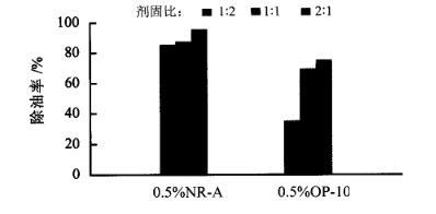 從圖2的脫附除油率來看,當(dāng)納米乳液濃度在0.5%時,除油效果最佳,脫附除油率達(dá)到95.7%;當(dāng)納米乳液濃度達(dá)到5%時,脫附除油下降一半,說明濃度過高的納米乳液反而降低了它的脫附除油效果;在低濃度下(0~1%),納米乳液和含油廢物按劑固比為2∶1處理含油廢物時,脫附效果優(yōu)于劑固比為1∶1的脫附效果。將0.5%的納米乳液NR-A與同濃度下的OP-10進(jìn)行脫附除油對比,實(shí)驗(yàn)結(jié)果如圖3所示。從圖3的脫附除油率可以看出,當(dāng)劑固比為1∶2時,納米乳液NR-A的脫附除油率(85.49%)是OP-10(34.73%)的2倍多;當(dāng)劑固比達(dá)到2∶1時,納米乳液NR-A的脫附除油率(95.74%)仍比OP-10(74.1%)高出20%。由此說明納米乳液NR-A的脫附除油效果遠(yuǎn)遠(yuǎn)超過常規(guī)表面活性劑。