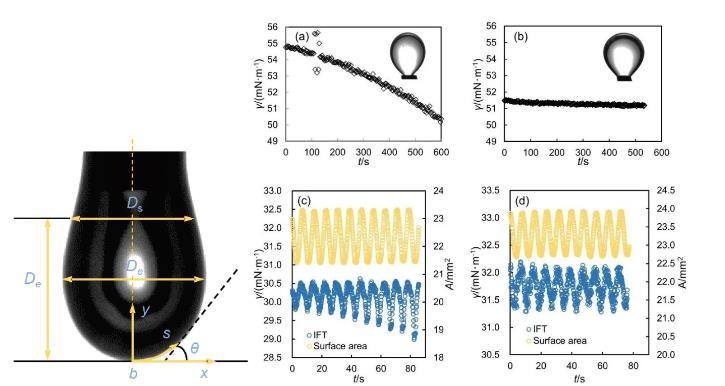 研究團(tuán)隊(duì)優(yōu)化了從樣品預(yù)處理、儀器改進(jìn)、實(shí)驗(yàn)測量到數(shù)據(jù)分析的全流程,提供了詳細(xì)的實(shí)驗(yàn)操作指南,涉及液滴控制、系統(tǒng)校準(zhǔn)和光學(xué)干擾處理等關(guān)鍵步驟。通過對氣水兩相和氣水油三相體系實(shí)際測量的有效數(shù)據(jù)和無效數(shù)據(jù)的展示和分析,驗(yàn)證了方法的有效性和準(zhǔn)確性。整套實(shí)驗(yàn)流程可基于不同實(shí)際條件在數(shù)天內(nèi)完成。圖2動(dòng)態(tài)懸滴表征(左圖);界面張力及界面流變性實(shí)驗(yàn)測量數(shù)據(jù)(右圖)本研究為界面性質(zhì)的測定樹立了新的標(biāo)準(zhǔn),通過優(yōu)化動(dòng)態(tài)懸滴表征方法,極大地提高了測量的可靠性和精度,體現(xiàn)了方法學(xué)創(chuàng)新;不僅對界面科學(xué)的基礎(chǔ)理論發(fā)展具有重要推動(dòng)作用,同時(shí)為材料科學(xué)、化學(xué)工程、環(huán)境科學(xué)等領(lǐng)域的實(shí)際應(yīng)用提供了技術(shù)支撐。