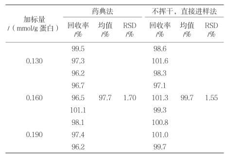 由表3可知,藥典方法測得的9次回收率的平均值為97.7%,RSD值為1.70%;不揮干,直接進樣法測得的9次回收率的平均值為99.7%,RSD值為1.55%。對兩組數據進行單因素方法分析,F=7.530,P=0.02<0.05,兩組數據有顯著性差異。方法優化后準確度更接近100%,這是因為優化后的方法不受揮干速度的影響[3],進樣溶液比藥典方法均勻,損失量相對較小。