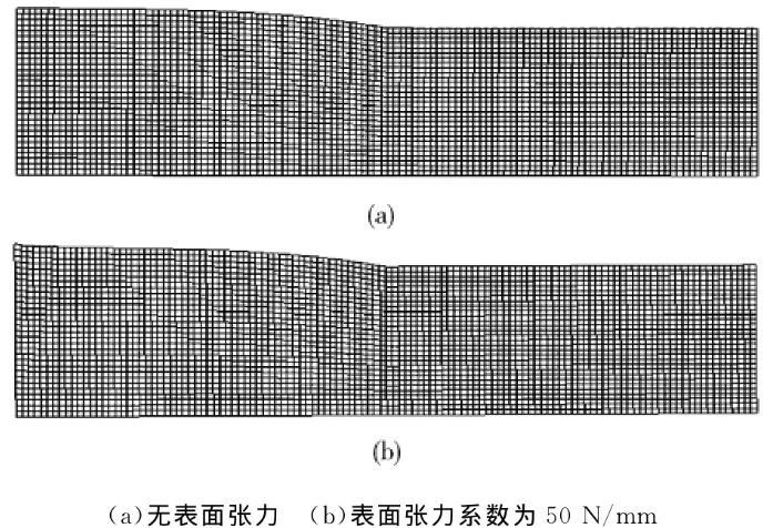 AE=1.2mm時,表面張力系數為零和表面張力系數為50N/mm時的網格變形如圖4所示。從圖4可以看出,有表面張力和沒有表面張力的時候,網格的變形并沒有太大的區別,只是網格的變形量略微有些不同。說明有表面張力的時候,自由表面的形變方式并沒有很大的變化。但在自由表面出口處的變形非常明顯。這說明表面張力對微擠出自由表面出口處的流場影響很大。這是因為自由表面出口處的邊界條件突然變化,從而導致表面張力在此處的作用效果有較大變化。