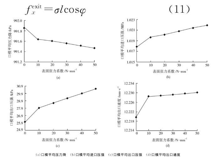 (2)在微擠出中,表面張力系數越大,擠出脹大越明顯,擠出口模內熔體的進出口壓強都明顯增大,口模內熔體的壓力降略微減小,平均出口速度略微增大,自由表面出口壓力與平均出口速度都明顯減小;