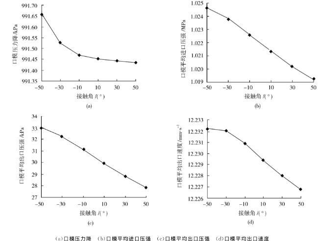 在表面張力系數為50N/mm不變時,接觸角取值:-50°~50°。得到口模壓力降、口模平均進出口壓力、以及口模出口平均速度曲線如圖8所示。由圖8可知,接觸角與口模流場參數的關系并不是線性關系。由圖6可知接觸角θ增大,自由表面擠出脹大比值減小,φ減小,表面張力對口模出口處的軸向分力如式(9)所示,牽引力隨著夾角φ值的減小而增大,使得材料在口模內的剪切能量損失減小,因此壓力降減小。所以圖8(a)中口模平均進出口壓力降減小。而圖8(b)、(c)中口模內熔體進出口壓強的減小是因為擠出脹大減小,自由表面對外做功減小,自由表面對口模的阻力減小。圖8(d)中口模平均出口速度減小是因為表面張力對自由表面的徑向分力減小,口模內熔體出口徑向速度減小,而熔體軸向速度不變,因此平均速度減小。