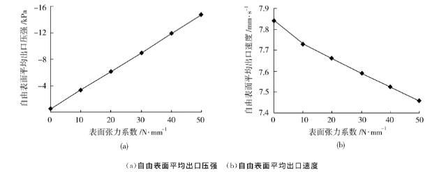 圖9表面張力系數對自由表面出口壓強與速度的影響