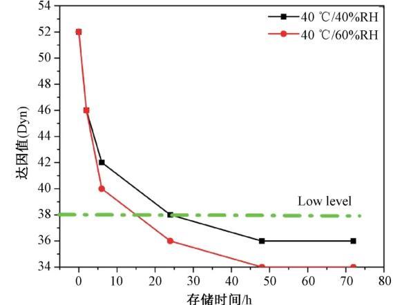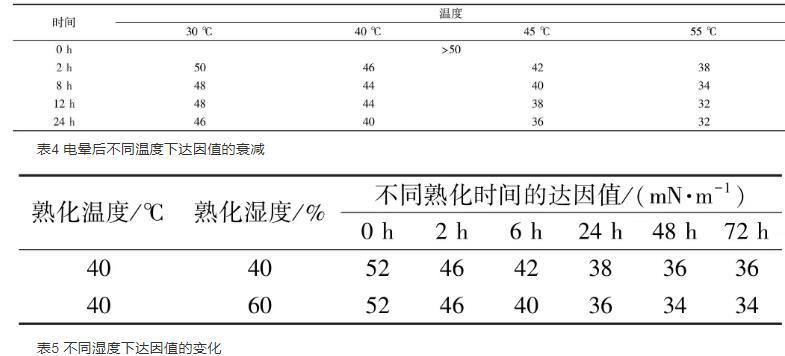 隨著保存時間的增長,背板的達因值也隨著逐漸降低。在低溫30℃下保存1d后達因值仍能達到48 mN/m,濕度越低,達因值下降越緩慢。溫度越高濕度越大,達因值下降越快。