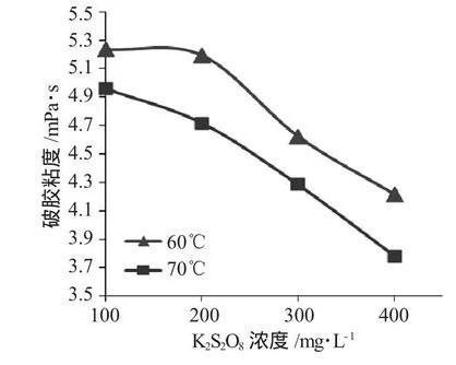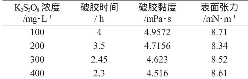 表2結(jié)果表明,溫度為70℃時(shí),隨著破膠時(shí)間增加,K2S2O8作為破膠劑的破膠液破膠粘度和表面張力是逐漸降低,當(dāng)K2S2O8加入量為100mg·L-1時(shí),4h后破膠液粘度為4.9572mPa·s、8.71mN·m-1,當(dāng)K2S2O8加入量為400mg·L-1,2.3h破膠后破膠液粘度為4.516mPa·s、8.61mN·m-1。