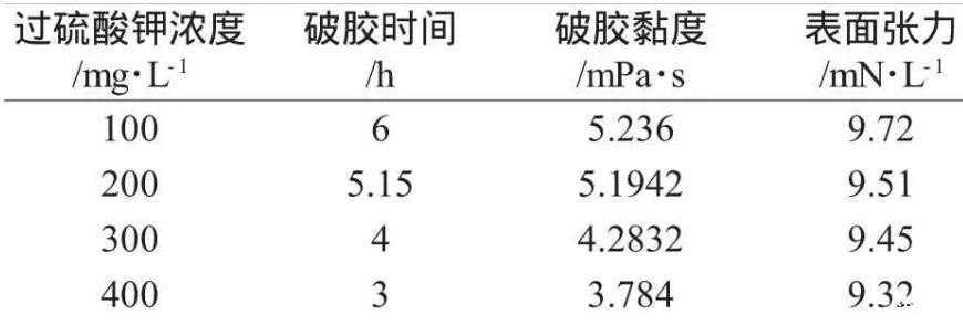 (1)在實(shí)驗(yàn)溫度60℃下,通過(guò)對(duì)比過(guò)硫酸鹽濃度不同,濃度越高,破膠時(shí)間縮短,破膠液粘度和表面張力逐漸降低。