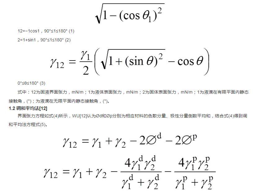 界面張力方程如式(4)所示,WU認(rèn)為?d和?p分別為相應(yīng)材料的色散分量、極性分量倒數(shù)平均和,結(jié)合式(4)得到調(diào)和平均法方程式(5)。