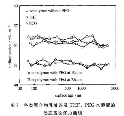 由圖7可見,有PEG參與的聚合體系制備的聚合物乳液表面張力較低(約5O~51mN·m左右),明顯低于四氫呋喃/水、PEG/四氫呋喃/水、無PEG參與的聚合體系制備的聚合物乳液表面張力(約54~55.5mN·rfl左右)。因為氣液界面張力受擴散物質本身表面活性強弱的影響,所以從四氫體系制備的聚合物乳液DST相近可以得出結論,即T≤PE。、F≤EG聚合物,而有PEG參與的聚合物乳液的界面張力說明c聚合物<n,說明有PEG參與的聚合體系制備的聚合物表面活性更強,而且這種較強表面活性的聚合物在反應的開始就已經形成。
