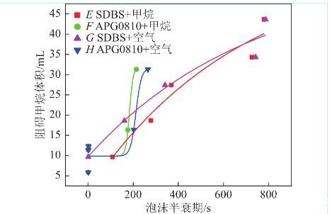 圖15為表面活性劑溶液泡沫中甲烷體積隨泡沫半衰期變化的曲線,半衰期包括甲烷泡沫半衰期和空氣泡沫半衰期。擬合度均在0.9以上,且均隨著泡沫穩(wěn)定性增強,泡沫對甲烷的緩釋作用越強。