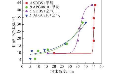 4)泡沫穩(wěn)定性是決定甲烷緩釋效應(yīng)的關(guān)鍵因素,泡沫穩(wěn)定性越強,越能有效控制甲烷流動。可直接采取空氣-表面活性劑泡沫的各項參數(shù)表示泡沫性質(zhì)。陰離子表面活性劑SDBS表現(xiàn)較好,泡沫穩(wěn)定性較強,隨著時間推移,SDBS也有比APG0810更好控制甲烷釋放的效果。質(zhì)量分數(shù)為0.15%時,10 min內(nèi)SDBS可以控制約占總通入甲烷體積87%的甲烷。120 min后仍可控制約占通入總體積49.16%的甲烷。