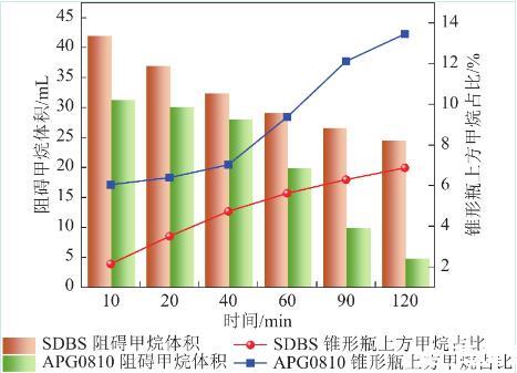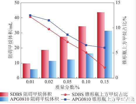 通過式(4)計算得到泡沫中注入氣體含量。圖10中柱狀圖可以看出,SDBS溶液泡沫對甲烷的束縛效果明顯優(yōu)于APG0810,APG0810溶液由于發(fā)泡性及泡沫穩(wěn)定性均弱于SDBS,故對甲烷束縛能力較差。質(zhì)量分數(shù)為0.05%的SDBS可控制27.43 mL甲烷,0.15%的SDBS可控制43.649 mL甲烷,占總注入甲烷體積87%。質(zhì)量分數(shù)為0.15%的APG0810溶液可控制31.33 mL甲烷,占總注入甲烷體積62.6%。