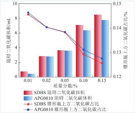 圖12為注入二氧化碳的氣相色譜檢測結(jié)果,計算出表面活性劑泡沫對二氧化碳的緩釋作用結(jié)果如圖12柱狀圖所示。相同質(zhì)量分數(shù)下,SDBS溶液對二氧化碳的緩釋效應(yīng)優(yōu)于APG0810。然而兩種表面活性劑對二氧化碳緩釋效應(yīng)均不顯著,SDBS表面活性劑溶液在質(zhì)量分數(shù)最大時10 min內(nèi)只控制了8.46 mL二氧化碳氣體,APG0810只控制了7.74 mL二氧化碳氣體。