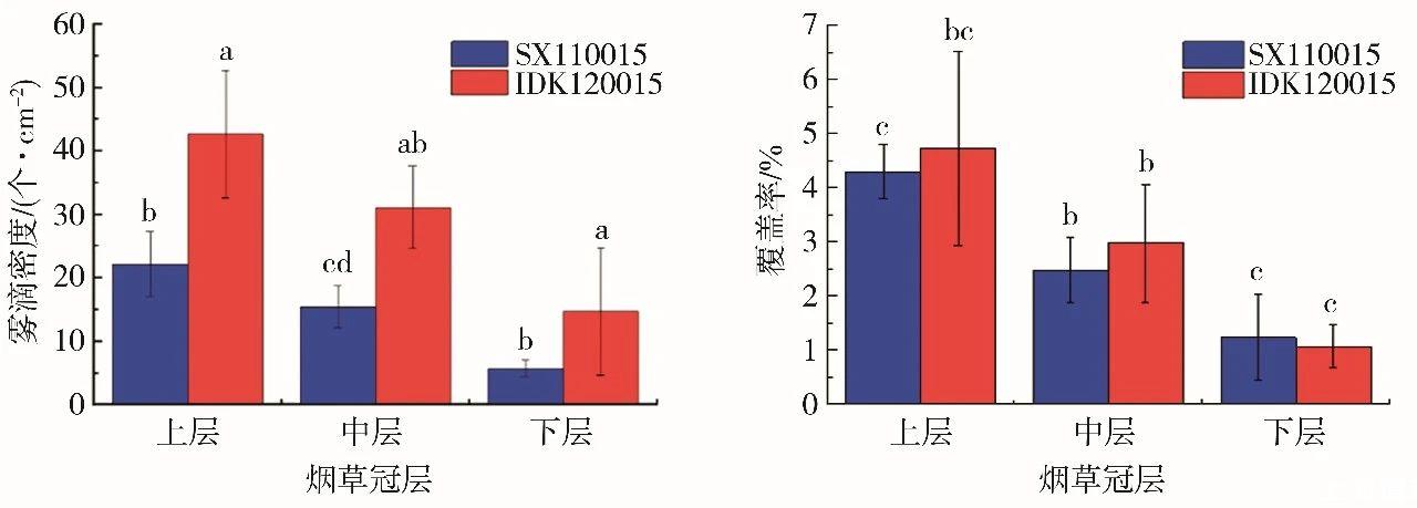 如圖4所示,與SX110015噴頭相比,IDK120015噴頭可提高藥液霧滴密度,煙草上、中、下冠層分別提高92.9%、101.6%和160.7%;在煙草上、中冠層藥液霧滴覆蓋率分別提高10.0%和20.2%,但在煙草下冠層藥液霧滴覆蓋率則降低13.8%。這是由于IDK120015噴頭孔徑小,藥液霧滴粒徑更細(xì),而SX110015噴頭的噴霧藥液霧滴的穿透性更強。因此,在使用時應(yīng)根據(jù)天氣條件和防治對象選擇合適類型的噴頭。