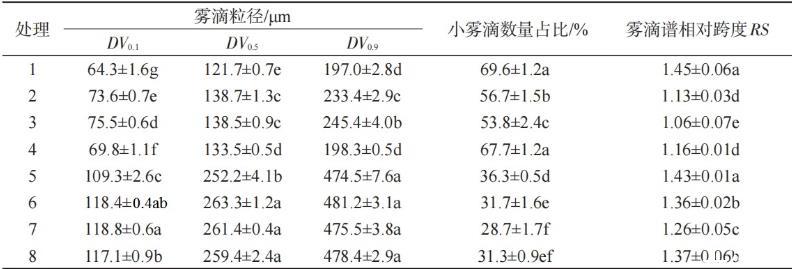 表4噴霧助劑及噴頭類型對藥液霧滴粒徑及分布的影響
