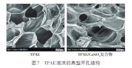 根據TPAE/無機粒子復合物泡沫的泡孔結構圖可以看出,相比較于純TPAE泡沫的閉孔結構,無機粒子的添加明顯促進了TPAE泡沫泡孔的打開。為詳細探究無機粒子的開孔機制,使用真密度儀對不同TPAE/無機粒子復合物泡沫的開孔率進行了測試,如圖6所示。無機粒子的添加都提高了TPAE泡沫的開孔率,表明無機粒子的加入是影響開孔率的關鍵因素?;赥PAE和TPAE/CaSiO3復合物泡沫中的開孔結構分析無機粒子對復合物泡沫開孔結構的影響(以CaSiO3為例),如圖7所示??梢钥闯觯僒PAE泡沫主要出現泡孔壁上,且形成的孔比較規則,這是由于純TPAE熔體強度低,泡孔壁容易破裂。而TPAE/CaSiO3復合物泡沫的開孔主要發生在泡孔的內壁以及幾個泡孔的相交處上,這是因為在泡孔生長過程中,由于CaSiO3的非均相成核,泡孔在CaSiO3分散相周圍成核生長,形成花狀的泡孔結構,而TPAE與無機粒子的相容性差,使得CaSiO3從泡孔壁上脫落,留下不規則的網狀結構,從而導致泡孔間相互連接。其他3種TPAE/無機粒子復合物泡沫的開孔形式同TPAE/CaSiO3復合物泡沫一致。圖8展示了兩種與TPAE具有不同界面張力的粒子(以CaSiO3和Talc為例)的添加對復合物泡沫開孔結構形成的影響機制。