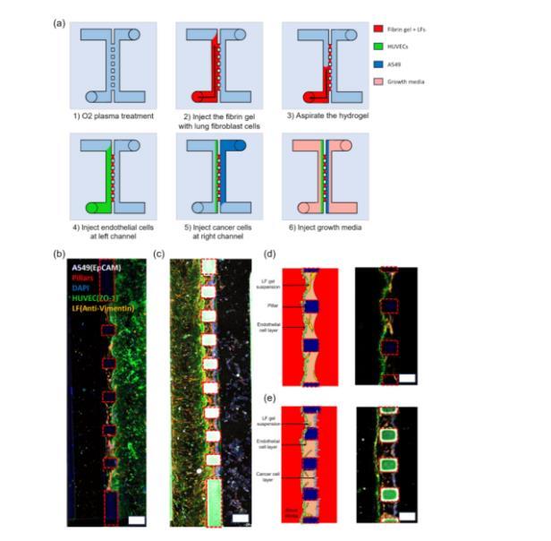 圖3通過細胞加載流程示意圖和熒光圖像,展示了微流體平臺在再現肺泡三維微環境方面的有效性。圖3a展示了細胞加載的步驟,包括在水凝膠薄膜兩側加入不同類型的細胞,以創建多層細胞結構。圖3b和3c展示了微流體平臺上與內皮細胞和肺成纖維細胞的共培養熒光圖像。水凝膠薄膜中含有橙色染色的成纖維細胞,水凝膠膜側面綠色層表示生長的內皮細胞層。這種結構模擬了肺部的基質和內皮層,為后續肺部疾病研究提供了生理相關的模型。圖3d和3e分別展示了細胞配置的示意圖和最大投影的共聚焦顯微圖像。在這些圖中可以看到肺成纖維細胞(橙色)和內皮細胞(綠色)在水凝膠薄膜的不同層次的分布情況,形成了一個三維的細胞共培養環境。圖像還顯示,細胞在培養過程中保持了較高的活力,并成功地在水凝膠薄膜周圍形成了均勻的細胞層。