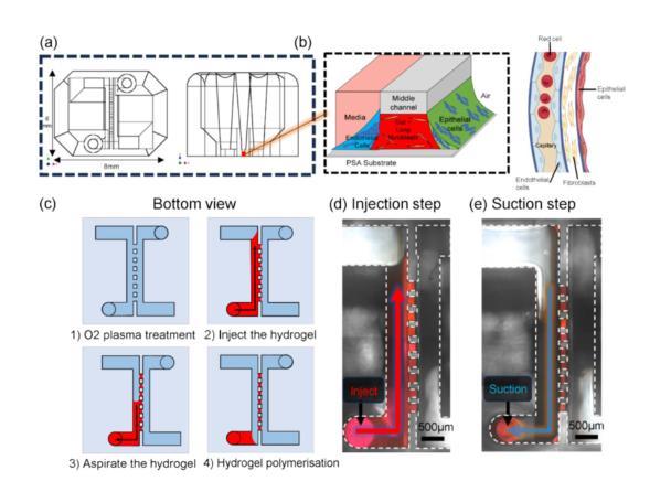 圖1展示了一個基于表面張力的開放式微流體平臺的結構和液體圖案化過程,用于再現肺部的三維細胞微環境。圖1a展示了微流體平臺的頂視圖和側視圖。平臺的中心區域包含微柱陣列,用于形成薄的水凝膠膜,兩側是包含不同細胞懸浮液的流體通道。圖1b展示了水凝膠和不同細胞層的位置安排,模擬肺部細胞環境的氣-液界面結構。圖1c到圖1e展示了圖案化過程的兩個關鍵步驟——液體注入和保持。首先,水凝膠液體通過微柱流動;當液體達到通道的擴展區域時,使用吸取器將多余液體移除,剩余部分被保持在微柱之間形成所需的薄層。這一過程中利用了表面張力的“毛細釘扎”現象,即通過幾何結構和表面特性來控制液體的流動和停留。