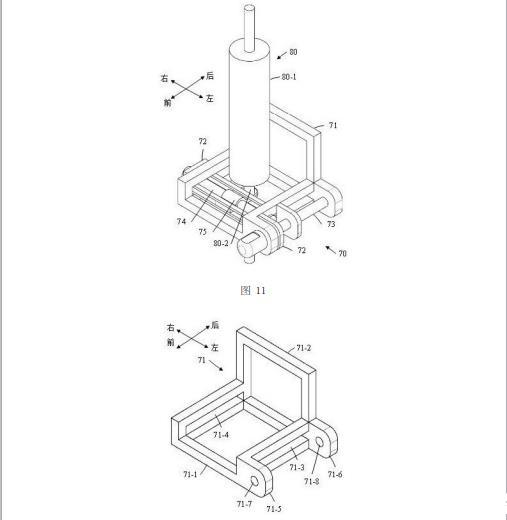 如圖13所示,滑動(dòng)座72包括第一U形板72-1、第二U形板72-2、蓋形板72-3、第一尾板72-4、以及第二尾板72-5。第一U形板72-1和第二U形板72-2的開口端都與蓋形板72-3的左側(cè)面(即里側(cè)面)固定連接,并且第一U形板72-1和第二U形板72-2均與蓋形板72-3相垂直,其中蓋形板72-3沿豎直方向延伸且蓋形板72-3上設(shè)置有通孔72-8,第一U形板72-1和第二U形板72-2均沿水平方向延伸;第一U形板72-1位于第二U形板72-2的上方,第一U形板72-1與第二U形板72-2相互平行且二者之間設(shè)置有一個(gè)縫隙72-9。在本實(shí)施例中,第一U形板72-1與第二U形板72-2相同。
