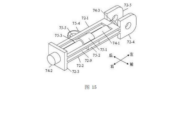 如圖10、圖11和圖14所示,滑動(dòng)座72活動(dòng)設(shè)置于固定座71上。滑動(dòng)座72的第一U形板72-1和第二U形板72-2的左端均穿入固定座71的左邊框的第一方孔71-3內(nèi),第一U形板72-1和第二U形板72-2的右端均穿入固定座71的右邊框的第二方孔71-4內(nèi);蓋形板72-3的左側(cè)面與固定座71的右邊框的右側(cè)面相抵接,使得蓋形板72-3對(duì)滑動(dòng)座72起限位作用;第一尾板72-4和第二尾板72-5的右端面均與固定座71的左邊框的左側(cè)面相抵接,使得第一尾板72-4和第二尾板72-5對(duì)滑動(dòng)座72起限位作用,并且第一尾板72-4和第二尾板72-5均位于第一延伸板71-5與第二延伸板71-6之間。