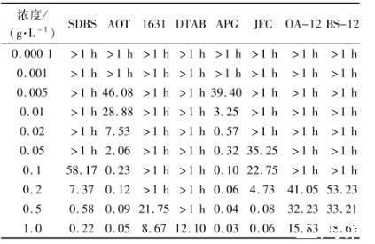 2)表面活性劑溶液的表面張力與其自身性質(zhì)及濃度密切相關(guān)。8種表面活性劑溶液表面張力隨濃度的增大先減小后在臨界膠束濃度附近穩(wěn)定,其表面張力均遠(yuǎn)小于水的表面張力。因8種表面活性劑的性質(zhì)不同,臨界膠束濃度值和表面張力值分別在0.04~053 g/L和25.61~34.79 mN/m之間差異較大。8種表面活性劑按降低溶液表面張力的能力由強(qiáng)到弱排序?yàn)椋篈PG>AOT>JFC>SDBS>OA-12>BS-12>1631>CTAB,非離子>陰離子>兩性型>陽(yáng)離子。非離子表面活性劑APG形成膠束和降低表面張力能力均為最佳,其臨界膠束濃度為0.04 g/L,表面張力為25.61 mN/m。