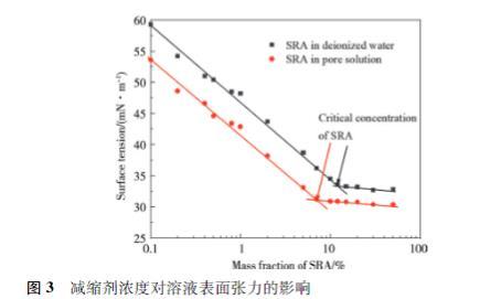 由圖3還可知,SRA在去離子水中混合時(shí),臨界SRA濃度約為11.2%,當(dāng)SRA在合成孔溶液中混合時(shí),臨界SRA濃度約為7.3%.這意味著溶液中的離子會(huì)使得臨界SRA濃度降低。對(duì)于混凝土,實(shí)際的內(nèi)部離子濃度更高,而臨界SRA濃度取決于孔隙溶液的離子組成,因此,實(shí)際的臨界SRA濃度更低。