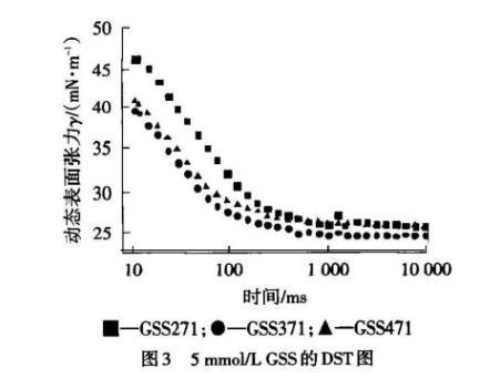 當溶液濃度c為1 mmol/L(c<cmc)時,由圖2可知,表面活性劑GSS271、GSS371和GSS471均表現為典型的DST變化曲線,即開始時DST接近溶劑的表面張力,后隨時間延長先快速下降,下降至一定數值后降速緩慢,最后DST基本保持不變。因為吸附剛開始時GSS在新鮮的氣液界面吸附量很少,所以界面張力接近溶劑的表面張力,隨著時間的推移,GSS分子逐漸吸附在界面,氣液界面張力降低;隨著吸附的進行,界面逐步趨于飽和,吸附推動力減小,GSS分子在界面吸附速率下降,因而DST下降緩慢最后趨于介平衡。GSS分子在界面達到飽和后還需進一步吸附與定向排列,因而DST曲線中的介平衡張力較對應濃度下的靜態表面張力大。當溶液濃度為5 mmol/L時,由圖3僅觀察到DST快速下降區和介平衡區。因為濃度較高(c>cmc),開始時便有較多的表面活性劑分子被吸附到表面,所以DST低于溶劑表面張力。